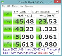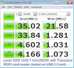 Finally, I conducted the same test on a computer with USB 3.0 port. This time, the Lexar card gave Read=45.5MB/s, and Write=23.5MB/s. See the screenshot I uploaded to ‘Customer Image’ section for details of the benchmark.